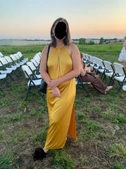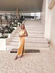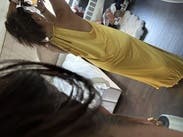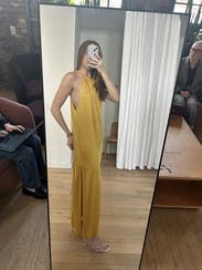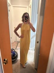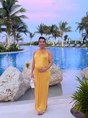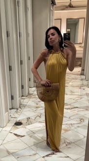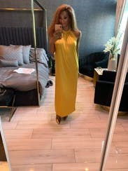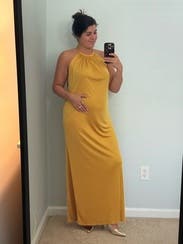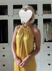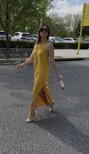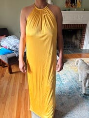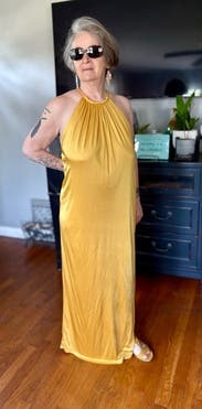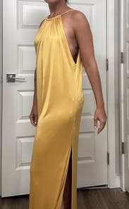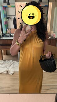 Wore this to a summer wedding while pregnant (about 5 months) and it was both comfortable and flattering. The fabric has a soft drape and the halter neckline gave it a chic, easy vibe. The side slit made it easier to move around, and the color is absolutely stunning in person—got tons of compliments. I paired it with gold heels, which worked perfectly. Overall it’s a bold, comfortable choice if you want to stand out. True to size with some give around the midsection, so bump-friendly.