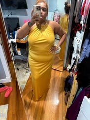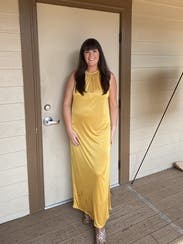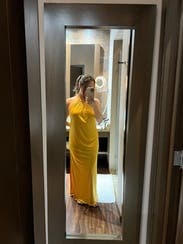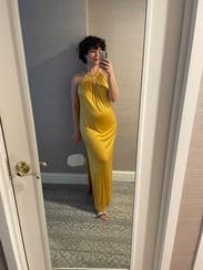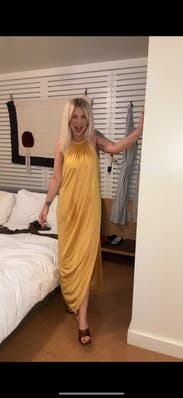 I wore this to a rehearsal dinner and received lots of compliments. The dress is beautiful, and I wasn’t able to go bra-less since I was blessed up top. Choosing undergarments could be difficult since this dress shows every line or crease, however the material feels luxe and super soft. It doesn’t wrinkle at all when you sit, and the yellow gold looks beautiful in natural light.