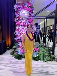 This gown is a beautiful color and so comfortable to wear. I will be renting again. Not too long for my short girly without heels