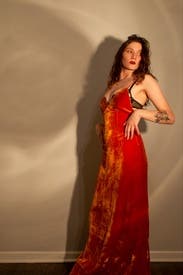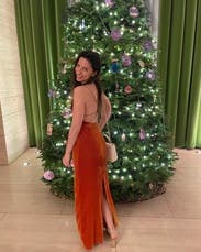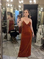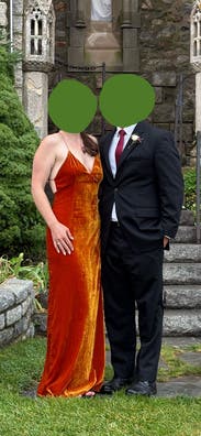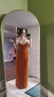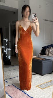 Orange velvet? Who knew?? Fit like a glove, straps aren’t really adjustable to be prepared for a deep V - but you will feel magical. Loved this dress.