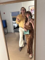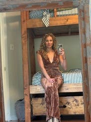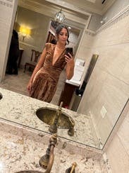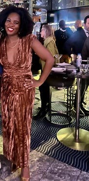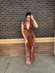 This velvety dress is a beautiful mocha brown for fall. IG @bethielife