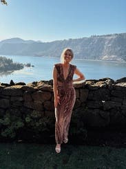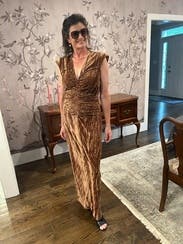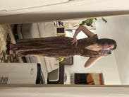 For some reason this picture looks a little off, maybe because it has shoulder pads but it was gorgeous on. The bottom is hemmed and so a little hard to walk in but really comfy, had multiple compliments but time and place since it’s velvet!