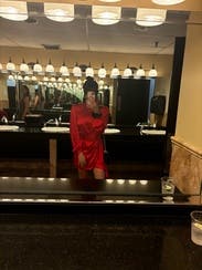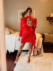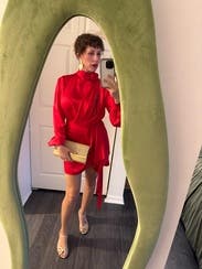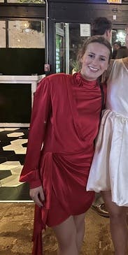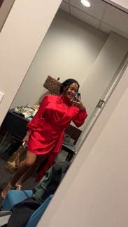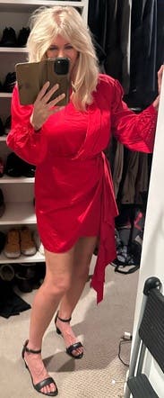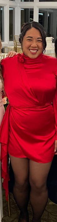Wore this for a Valentine’s Day engagement party and got so many compliments! The material is so nice & thick too that l didn’t have to worry about it staining from water like I initially expected!! Could’ve worn a small or medium but ended up going w a small - 5’7” 6-8 usually!