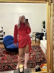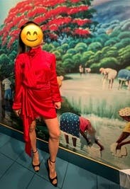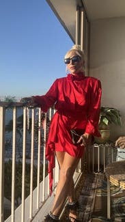 Wore this to NYFW! Such a great pop of color, and fit perfectly! I used a sticky bra for the open back and that worked great! Very comfy silky fabric