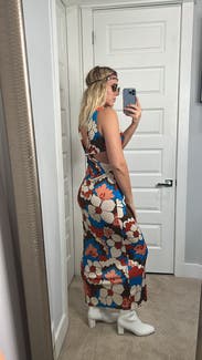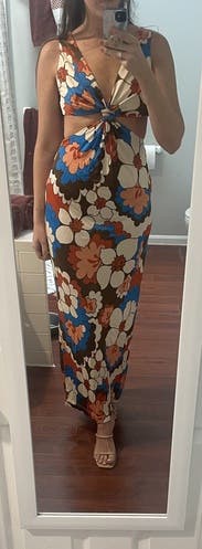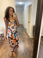 The perfect dress for showing off your curves. The cutouts hit perfectly to accentuate your waist, the material hugs in all the right places, and the busy print is very forgiving. Only thing I would say is the top might be tricky with a larger cup size, but other than that, a knockout number.