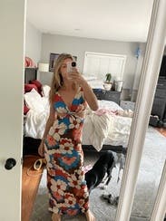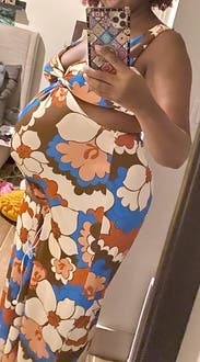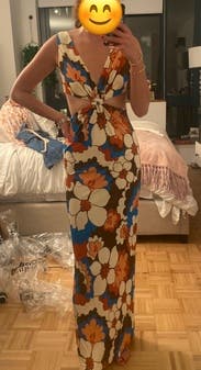 I loved the retro print of this dress. The length and fit were perfect too. I couldn’t wear a bra with it, so I used double-sided nipple covers to prevent accidental slippage. Will probably rent again!