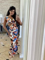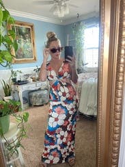Love this dress! Stretchy and comfy material good for warmer weather. I'm 6 months pregnant and the size small fit perfectly. At 5'7" the length was also great. I wore flat sandals :) the bust was slightly big I probably would have gotten the XS without the baby bump! Also tough to wear a bra with this dress. Overall love and perfect for welcome party in Mexico!