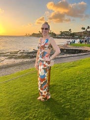 Great dress in a slinky fabric. The fabric isn't super light so it's forgiving but still light enough for warm weather (this was in Puerto Rico)