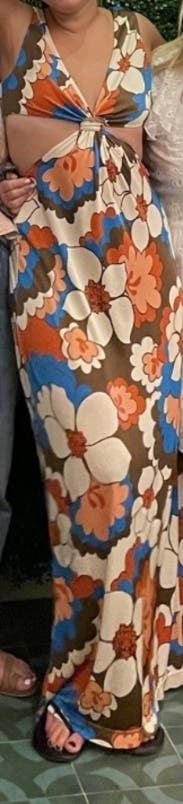 I didn’t end up wearing this because I wore something else but I really like the dress. It’s nice for shorter ladies bc it’s too long so u can do flats or heels and you don’t have to wear a bra because the material is nice and thick. When I have somewhere else to wear it - might rent in the future! Has fun 60/70s vibes for sure.
