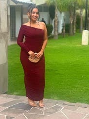 I could live in this dress! Perfect fit, great for curves. It’s a beautiful, rich color with a great fabric. I didn’t even have to unzip the zipper, there’s good stretch. Rented the L and XL - wore the L. The XL was big on top. It’s a perfect dress!
