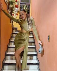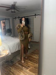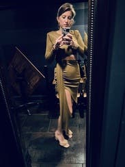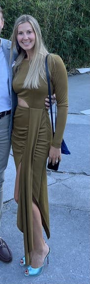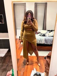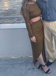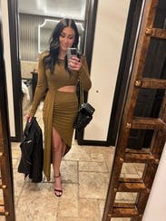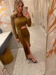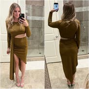 Super cute, on trend dress, in a unique color. Excellent fall choice. I'm carrying a bit of extra weight for me still from most recent baby and I'm not super confident in my stomach area right now, and this dress allowed me to be/feel sexy and show SOME skin, while also having the perfect draping and pleating to make it forgiving in the lower belly (with a high waisted thong shapeware too I might add). I felt confident and thought it looked pretty good too. Tons of compliments, which is always nice to hear and icing on the cake. Hubby loved it too.