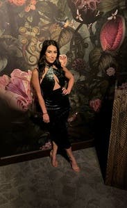 I ordered both a small and a medium in this dress because I wasn’t sure on sizing. Both fit great and I would’ve been happy in either. I ended up wearing the small for the wedding. This dress was comfortable and stretchy and I got so many compliments. A few warnings: - the inside of the top is velvet as well, so you’ll absolutely want nipple pasties because that chafe is UNREAL. - the top moves around a lot underneath the criss cross area, so I was constantly checking to make sure it wasn’t exposing too much. - the criss cross is a little tight on the front off the neck in the small, so if you’re sensitive to that, keep it in mind. Other than that, I loved this dress and would absolutely rent it again.