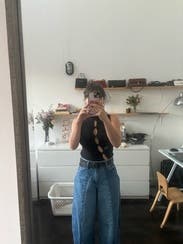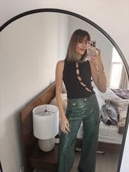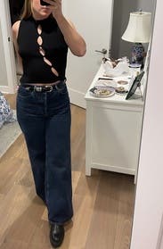 Really nice going out top. Fits a little better with a low rise jean or skirt since the fabric is on the thicker side (bunches a little when tucked). Would recommend if you're in the market for a spicier top.