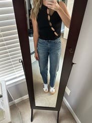 Didn't wear bra and was a cute top to pair with jeans (though not high rise because it interferes with the cut outs)