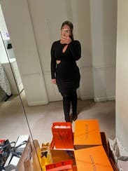 The fabric is substantial and has some stretch. The zippers on the wrists are so fun! I loved this dress so much but the cutout was not ideal. Maybe if I sized down and it was more snug it would be better but it showed my bra or way too much breast (if I went sans bra). I didn’t end up wearing this. I also went off the sizing that others selected and I could have sized down given the stretch. I’d try it again in a small size but unfortunately not for this holiday work party.