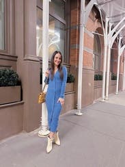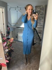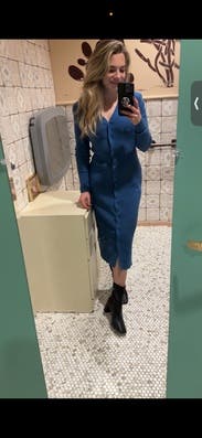 Wore this dress paired with knee high stretch boots and it was a perfect combo! The shoulder pads gave this dress a little extra which was a great bonus. Sometimes sweater dresses can feel frumpy, but the shoulder pads helped elevate and give it a little structure. I left the bottom 2 buttons unbuttoned to give a little more movement to the dress. Super comfy without looking frumpy!