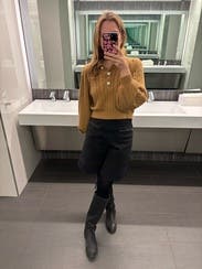 Paired this with a leather mini and boots. I love the balloon sleeves. The color is a little more mustardy than I like but it's soft not at all itchy. Very short/ cropped so it needs high waisted pants or a skirt.