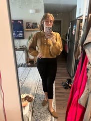 I really liked the look and fit of this sweater, but the color was not great for my skin tone. Also, by the end of the day, it felt really itchy on my chest/neck.