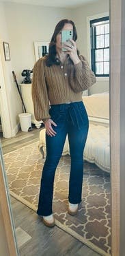Such a cute, warm sweater with a slight itchiness. Hits at my waist just right.