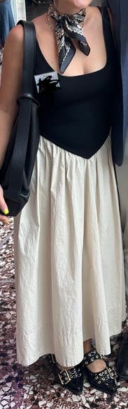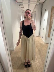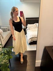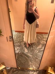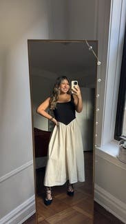 Wish the top was a little more fitted. The top and bottom were very different fabrics and I didn’t really like that. The black top was thicker whereas the bottom cream portion was very thin