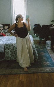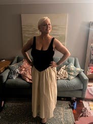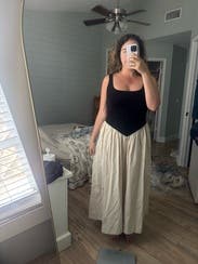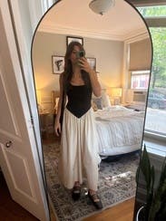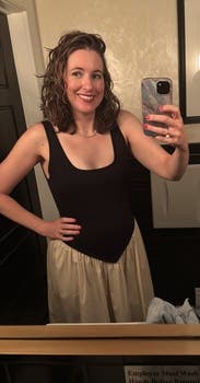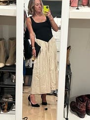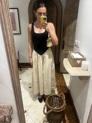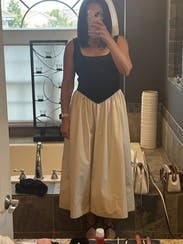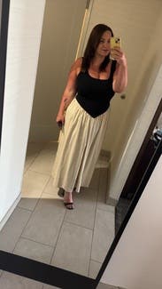 Loved the style and received many compliments. My only complaint is that the black knit stretched out easily and already was slightly large for a small. I kept adjusting to make sure the top of my strapless bra didn’t show. An extra small would’ve been too small in the waist.