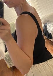 Just not a great fit. The straps are very long. top is really stretchy. The back rolls no matter how I pull it down. Tried to show that in the pic. I’m usually a large and sized down based on reviews. A small would have been better. Which is shocking.