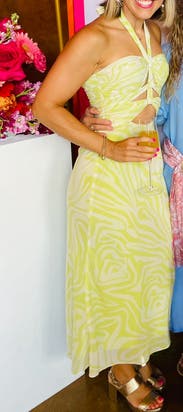 This was very fun to wear! A little out of my comfort zone but I loved it nonetheless. It fit me well, I’m usually a 0-2. It ties at the neck providing some adjustment possibilities with the top part of dress. I loved the length. This was great for my beach vacation event.