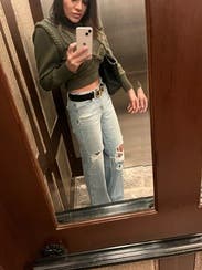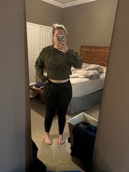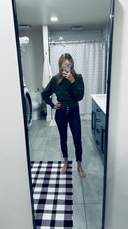 This sweater is adorable but very stiff and hard to get on. I wish it were just a tiny bit longer. You have to wear it with super high waist jeans or your belly button will show.