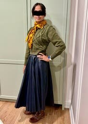 Great fall piece that is a somewhat bulky sweater that keeps it polished with a perfectly cinched cropped waist. Even though I’m 5’6.5”, I am pretty short waisted (and leggy), and this hit me right at my natural waist. Worn with the high waisted RTR skirt pictured here, or most high waisted pants/jeans, it’s not midriff baring on me, but if you’re a similar height but differently proportioned, it may be more risqué for you. The fabric is definitely not soft, and this size S is beginning to get a fade spot right in the front (I can see it but it’s probably not super noticeable to others who aren’t staring closely). I’m on the smaller end of a size 4, so was torn between getting the S and XS, but erred on the larger size based on reviews. I think it would’ve gotten tight in the shoulders if I’d sized down.