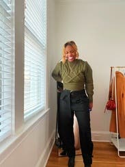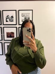 I ordered a size up after reading reviews and I’m glad I did. This sweater is so fun and the details allow you to dress it up for a date night or wear for an everyday look.