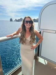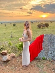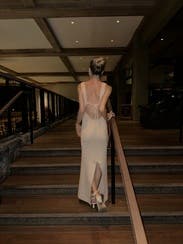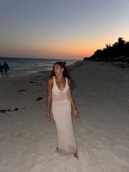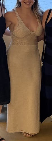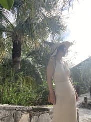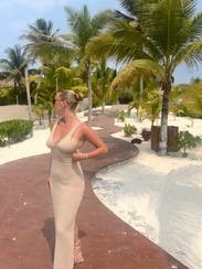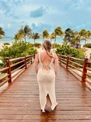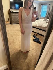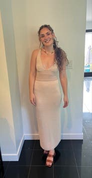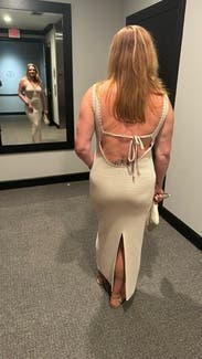 Wore for my rehearsal dinner in Mexico. Bottom of the dress hit right under my ankles. The open back sits low and the front was low on the chest, but boob tape fixes all.
