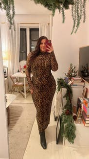 Medium on me was a looser fit. It is double lined so couldn’t see the black bra underneath. Half zipper closure in the back was another plus. Super cute and great for evening!