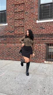This Ronny Kobo Collective turtleneck top features a bold leopard print, offering a statement piece for any wardrobe. Pair it with sleek black trousers for a sophisticated look, or go full-on daring with the matching skirt for a coordinated ensemble.