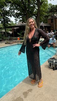 A sexy and attractive pool cover up! Love the fit. I’m usually a size 6 and this fit well. It’s also lightweight enough to wear poolside even though it’s black which I was worried about.