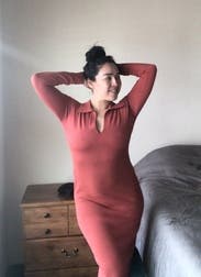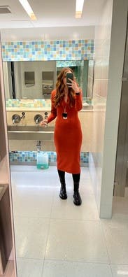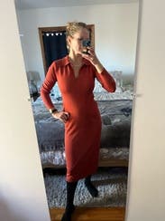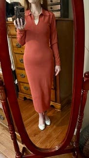 I loved this dress! Good for a cool (40s) but not cold-cold day. Hugs the curves. Super comfortable, thin-ish knit. Loved the burnt orange.