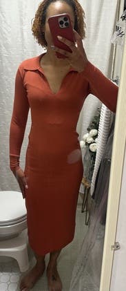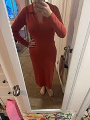 This dress was a little bit loose on me but was so comfortable. More of a burnt orange than red but a pretty color and a flattering neckline