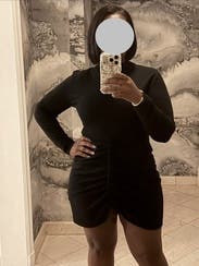 Wore this for a fall date night! Sexy but still comfortable and in a warm material. The front ruching is flattering but NOT adjustable. I used shapewear to get the silhouette. The upwards cut was a little too high for me to feel comfortable wearing it in a more formal setting - but great for a date!