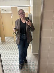 The cut of this blazer is cute, but the fabric is too this so it just looks rumpled. Somehow it also rode up on me so I was constantly pulling it down in back. The opening at the cuff is about 3/4 of an inch wider than any other blazer I own, it just didn’t look cute