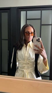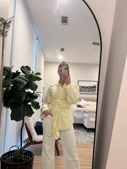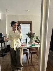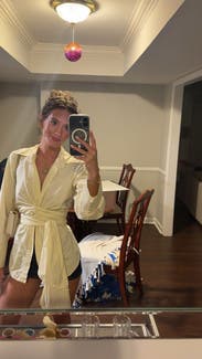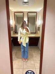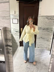 So many compliments, flattering to my figure, true to size. Wear with high rise pants as the bottom is open. Took a couple of tries to tie it. Loved the color buttery yellow.