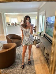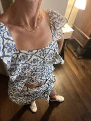 Loved this outfit and wore multiple times for dinner, concert and lunch. Top didn’t have much give but didn’t need a bra and the ruffles weren’t too much! Get the set!