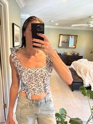 Paired with the matching bottom when going out and with white denim shirts for a more casual every day look. Kept the top bc it’s perfect. There is the scrunched back, which I thought would be a little forgiving, but the front of the shirt is not bc it zips. I went with the XS and probably could’ve gone w a small. Too late now, I am not returning it!