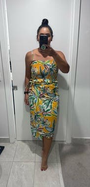 Loved this so much. The skirt and top came brand new with tags and was a nice crisp cotton, great for a hot summer night. It leans a bit more orange than yellow but I was happy either way. I decided to get a M in the top instead of S to hedge my bets that stretchy fabric wouldn’t look big and I was so glad I did as I think a S would’ve been really snug. Will absolutely rent again!