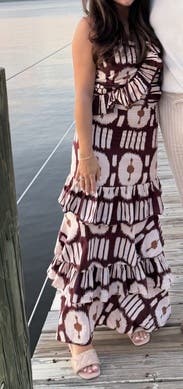 This tiered maxi skirt from Ro's Garden features a bold, earth-toned print, perfect for a bohemian-inspired look. Pair it with a simple tank top and sandals for a relaxed yet stylish ensemble.