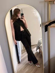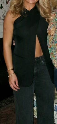 Wore this for a night out with the girlies and it was a hit! It’s a vest-like material and feel with a unique cross over. I loved it - it felt super high quality, chic and elevated. The bottom part did swing open a good bit for me, so I wouldn’t wear for anything on the more formal side.
