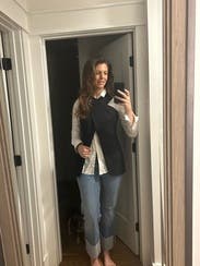 Great vest arrived new with tags. I wore it with a turtleneck underneath and not nearly as cute as without.