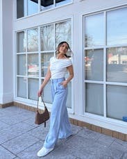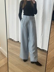 These wide-leg trousers by Rosetta Getty Collective embody effortless elegance with their fluid drape and light blue hue. Pair with a matching blazer for a cohesive, chic ensemble perfect for sophisticated events.