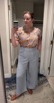 Wore this set to a work conference and as separates through out the week. Very flowy and never overheated. Definitely size down! I wore a 4 in the pants (usually a 8/10) but could have gone for a 6.