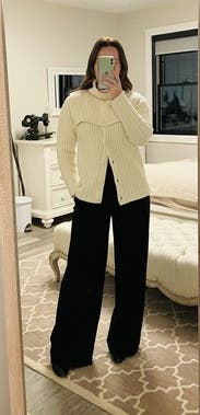 I loved this sweater! Very warm and cozy. Knit is very tick and plush. Easy to pair with all kinds of pant/skirts for a range of casual to more formal looks. Fit is flattering while also super comfortable.