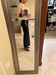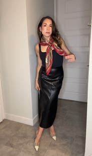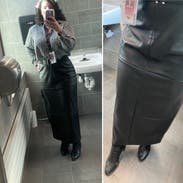 I’m so sad to be returning this amazing leather like pencil skirt. Surprisingly It fit well over my curvy hips. It actually was quite slimming. I To be safe, I wore a shaper underneath. I am 5’4” and it was a bit long although I prefer the midi look. Would definitely be too long for ladies shorter than 5’4”.. I will definitely rent this again.