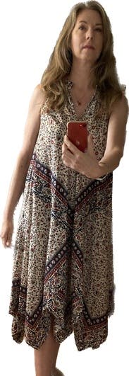 This dress was very easy to wear. Love the pattern and the fit, very free and flowy. The only reason I didn't buy it was because the base color of the print wasn't great against my skin.